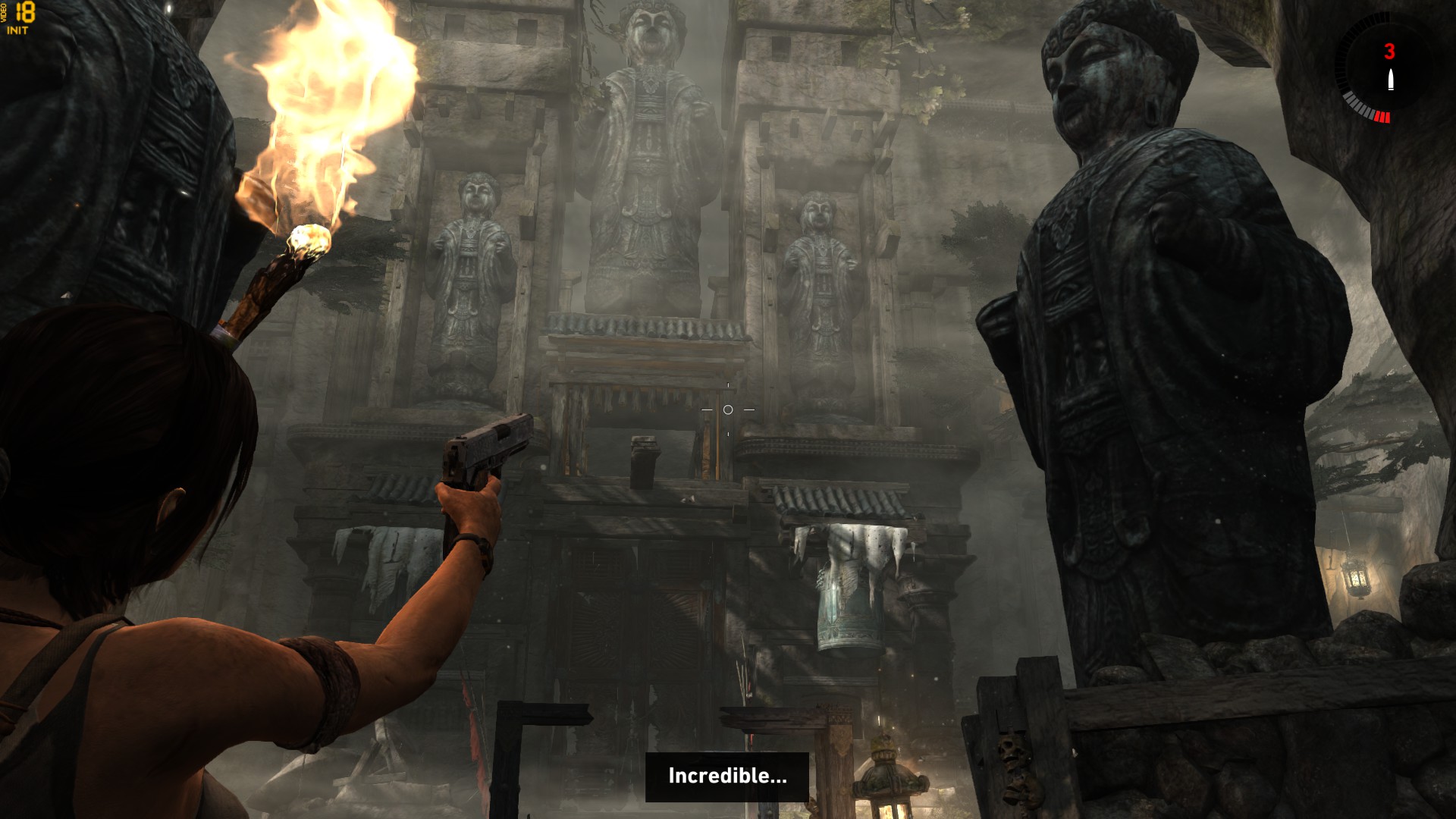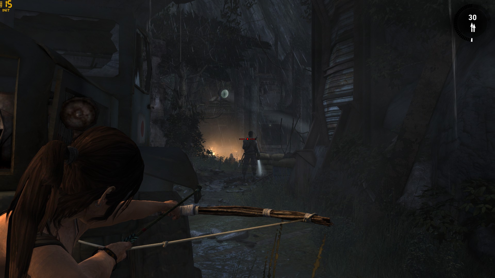 By that, I don’t mean that the shootouts are terrible. The controls are fine (even with a gamepad), and the cover system works well – Lara automatically moves in/out of cover without my needing to press a button; I’ve never gotten killed due to inadvertently moving out of cover; etc. Rather, the problem is that as a cover shooter, Tomb Raider feels rote. Hide behind barrier, shoot; when enemy flanks or lobs grenade, move to the next barrier; shoot; repeat. There’s little room for player ingenuity or “interesting decisions”, in contrast to the puzzle and stealth action segments (or, for that matter, more imaginative shooters such as Deus Ex: Human Revolution, whose uneven firefights challenged me to use every special power I had). And yet, it’s these increasingly repetitive blam-blam segments that Tomb Raider keeps throwing my way.