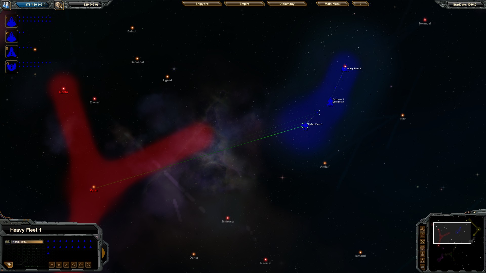 Now, I love the ideas embedded in this screen. You choose the composition of each fleet, and with the click of a single button, you can order your yards to produce enough ships to bring the fleet up to full strength. (The red outlines, in the above screenshot, show the missing ships.) Even better, you can save and load your fleet compositions. Cool! But actually manoeuvring fleets is a haphazard affair – while there is an option on the ship design screen which promises to make ships stick to formation, it is not enabled by default. I only discovered this when I tried laying siege to an enemy homeworld, only to see my mighty Strike Fleet jump into system a few ships at a time. That… did not end well.