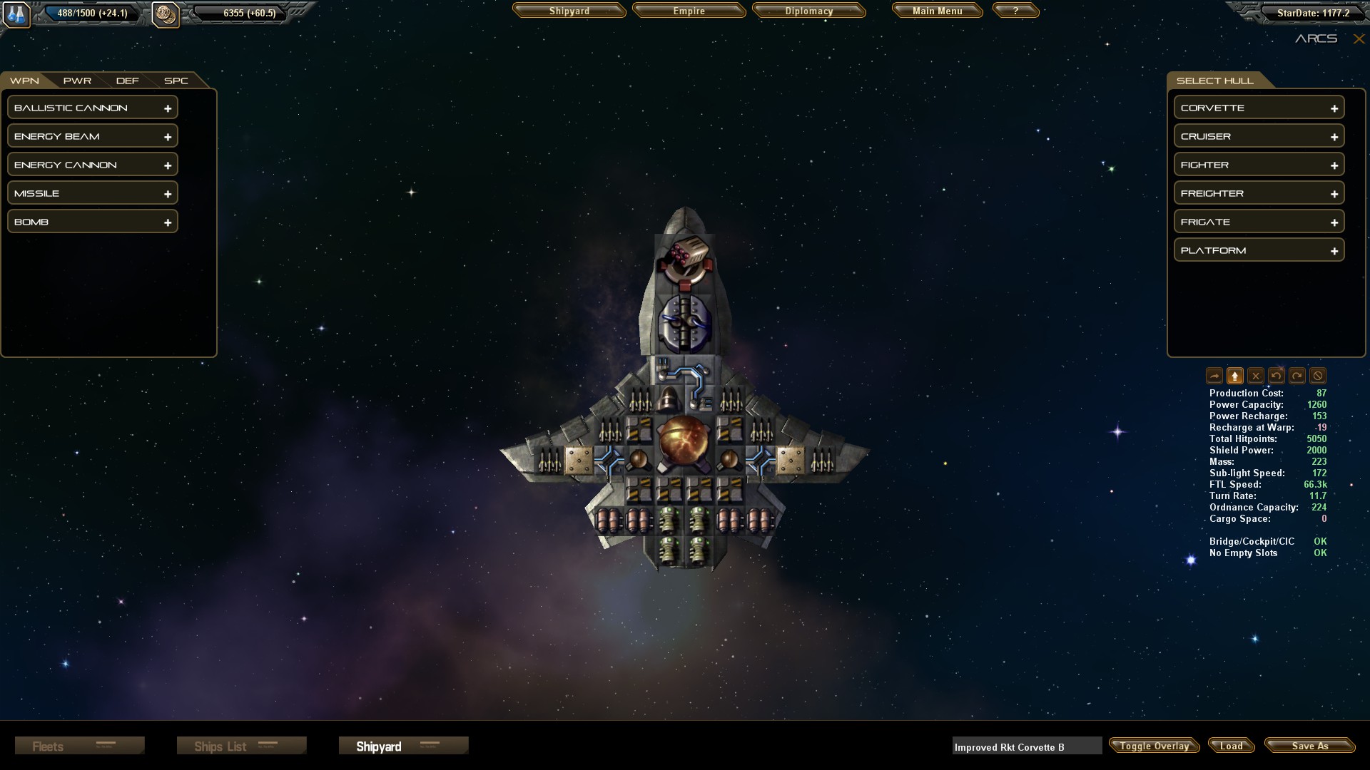 Straight away, you can see one of StarDrive’s distinctive features – most space 4X games (Master of Orion, Space Empires IV, DW, etc) give the player a “budget” per ship hull and then let the player fill it up as he/she chooses, but in StarDrive, you’ll choose each component’s precise location within the hull. This matters. For instance, reactors are highly explosive, so instead of scattering them throughout a ship, it might be wiser to wall them off with bulkheads and run a power conduit through the hull instead. Add in trade-offs between different weapons and hulls (Do I research and build energy weapons, which drain power? Rockets and mass drivers, which use ammo? Lots of small fighters, or a few cruisers?), and the result is an intricate system that dares me to learn its ins and outs. But UI issues rear their head here, too: if I place a component in the wrong place, why can’t I drag and drop it to a new one? Why do I have to delete the component, go back to the menu, and then place a brand new one?