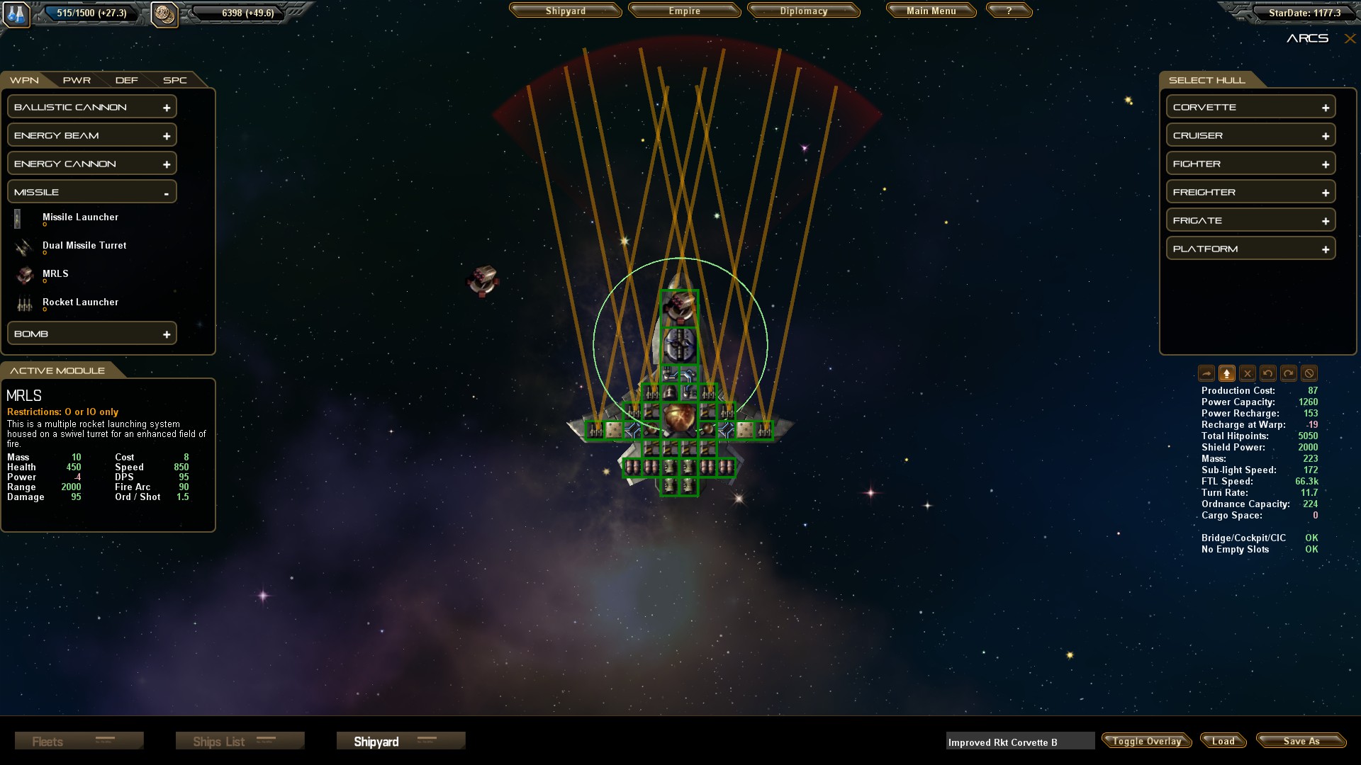Speaking of the ship design screen, I’ve posted this below. The top screenshot provides a zoomed-in view; the other is zoomed out and shows the selected design’s firing arcs: